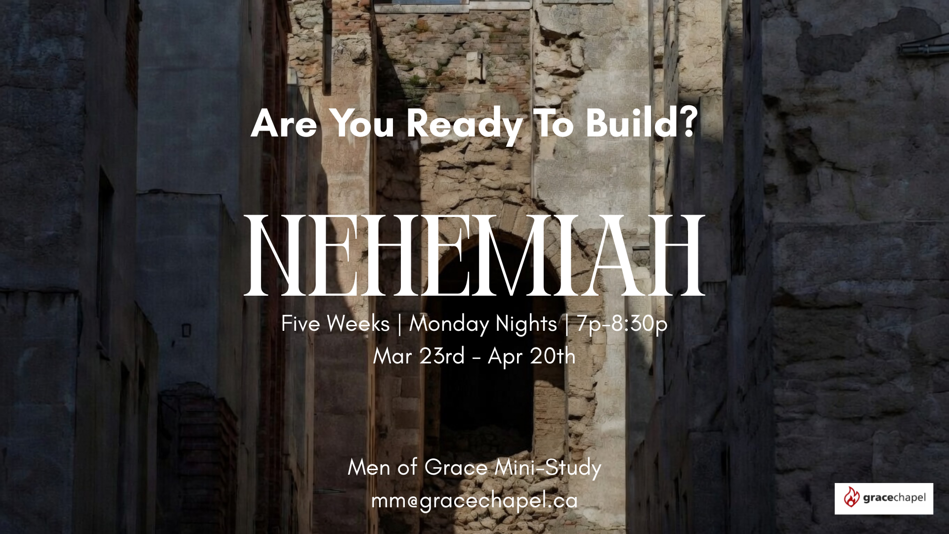It’s simple — just send an email to mm@gracechapel.ca and we’ll get you set up. Every registered participant receives a free study guide to use throughout the series.